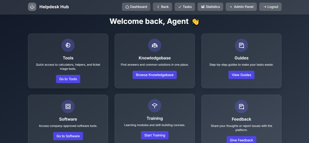Helpdesk Hub is a sleek, purpose-built web application designed to empower IT support agents with faster workflows, smarter tools, and a central place to manage their day-to-day tasks. Built entirely in Python (Flask) and engineered to grow over time, this platform transforms scattered processes into a single, intuitive experience that boosts efficiency for frontline support teams.